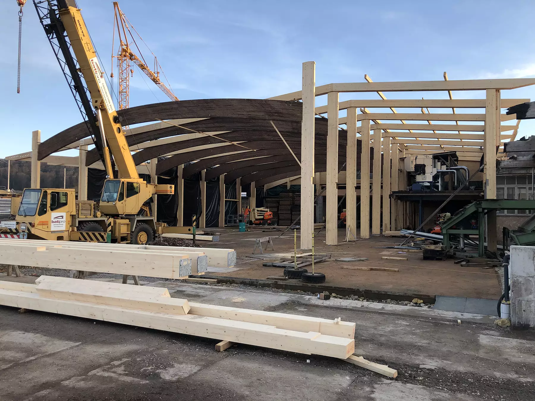 Une fois pris en compte l'ensemble de ces paramètres par le bureau d’études compétent, un nouveau point de départ a été donné. Les plans des nouveaux hangars ont pu être établis. La forme de la nouvelle halle a été adaptée aux contraintes géométriques des cintres existants afin que les anciennes arches puissent être associées aux nouveaux éléments de la charpente en sapin/épicéa et hêtre.
