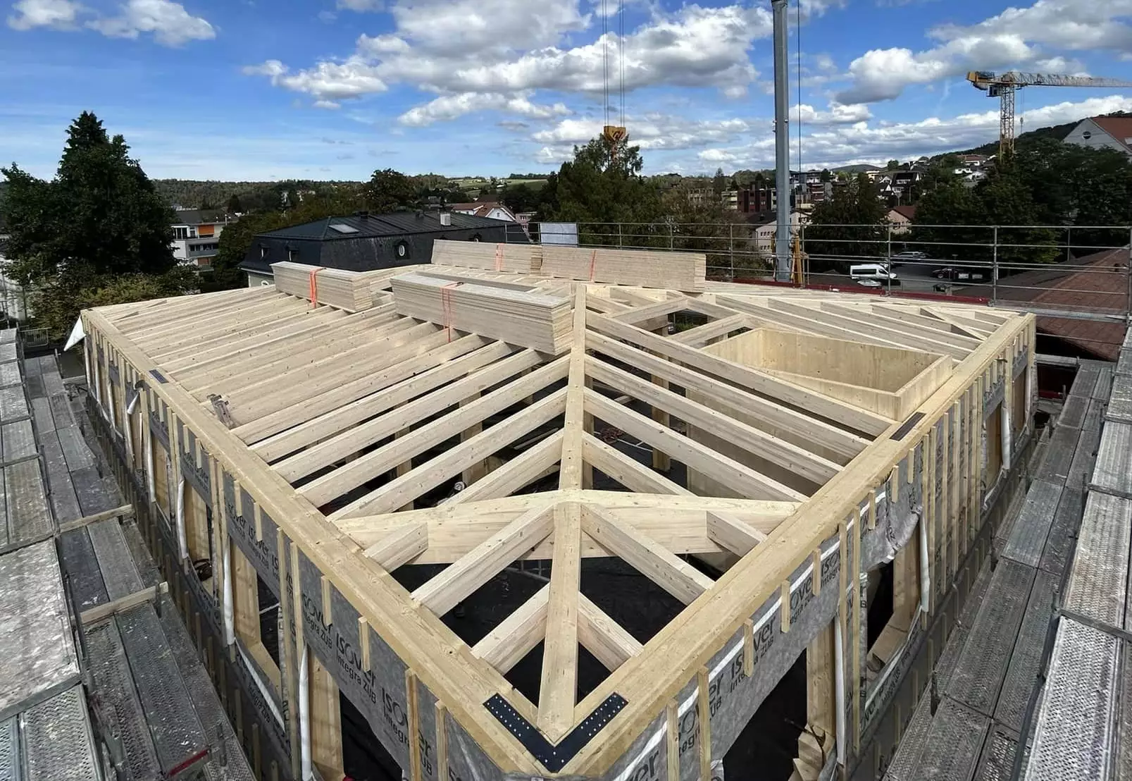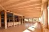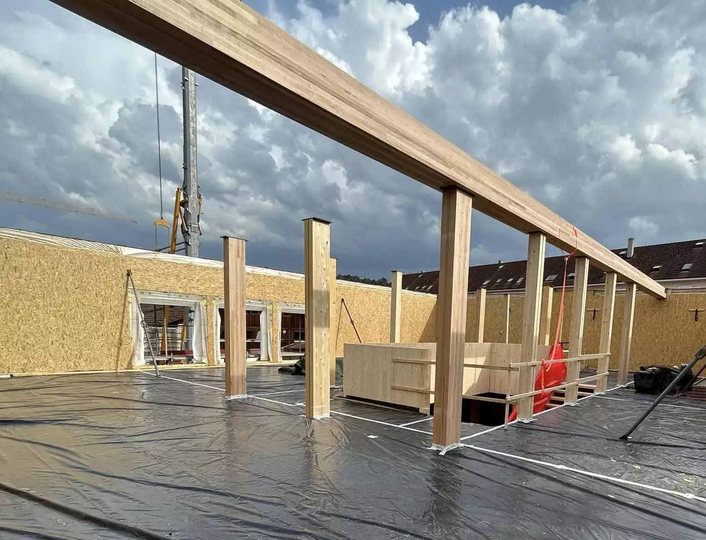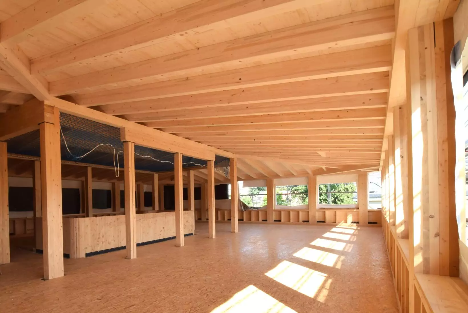 L’ossature et les éléments porteurs ont été réalisés en bois tasseaux-collés (BTC) de hêtre et en bois lamellé-collé (BLC) résineux, une combinaison qui exploite pleinement les atouts mécaniques et esthétiques de chaque essence. Le hêtre, dense et rigide, apporte stabilité et précision dans les assemblages, tandis que le résineux, plus léger, permet une flexibilité architecturale et une mise en œuvre rapide.