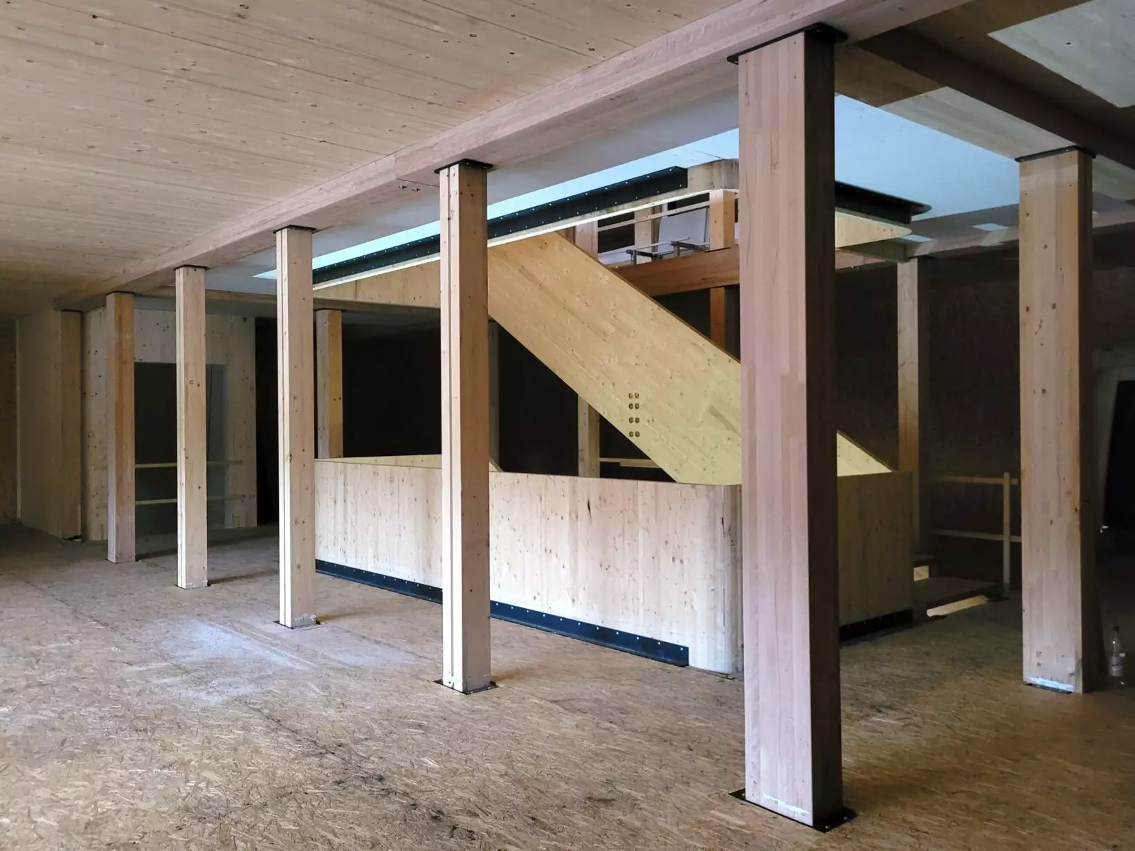 La maîtrise technique du collage et la qualité du bois régional garantissent une performance structurelle durable et un rendu visuel chaleureux. Les surfaces en hêtre apparent confèrent une identité forte à l’édifice, évoquant le lien entre le patrimoine naturel étudié et la matière première qui le compose.