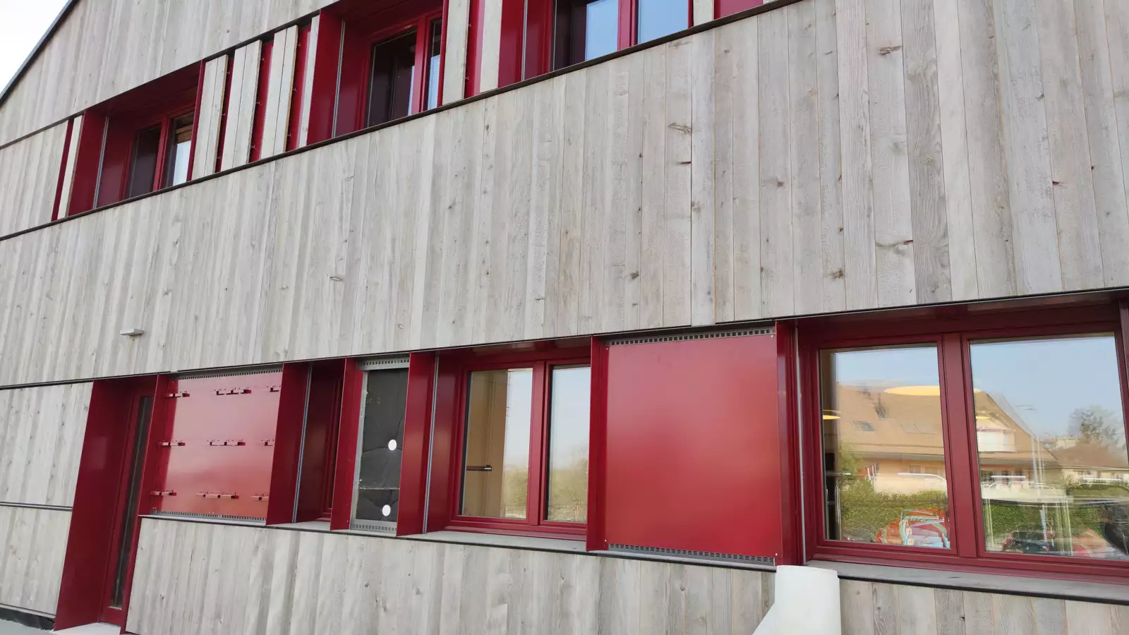 Isolation périphérique et habillage bardage bois vertical de la salle polyvalente au centre ville d'Aclens.