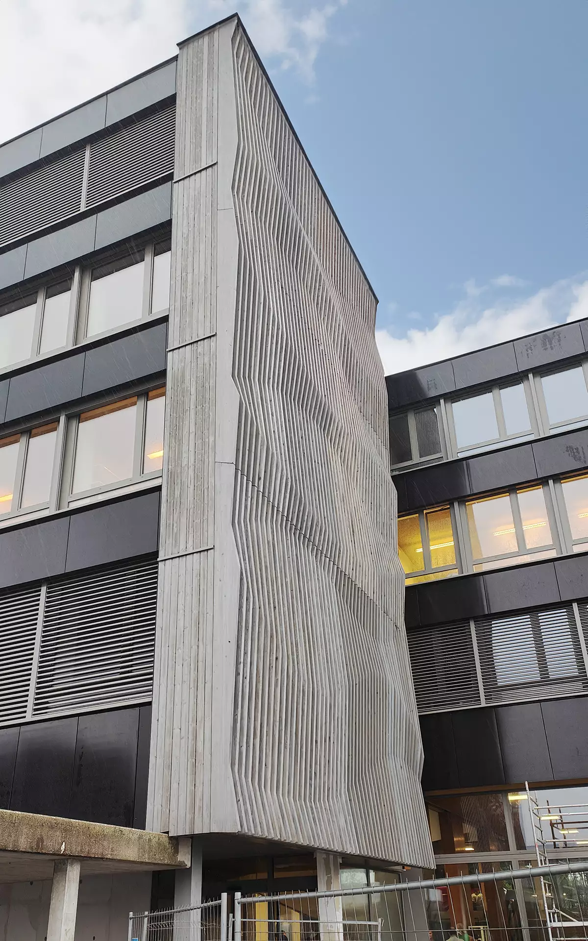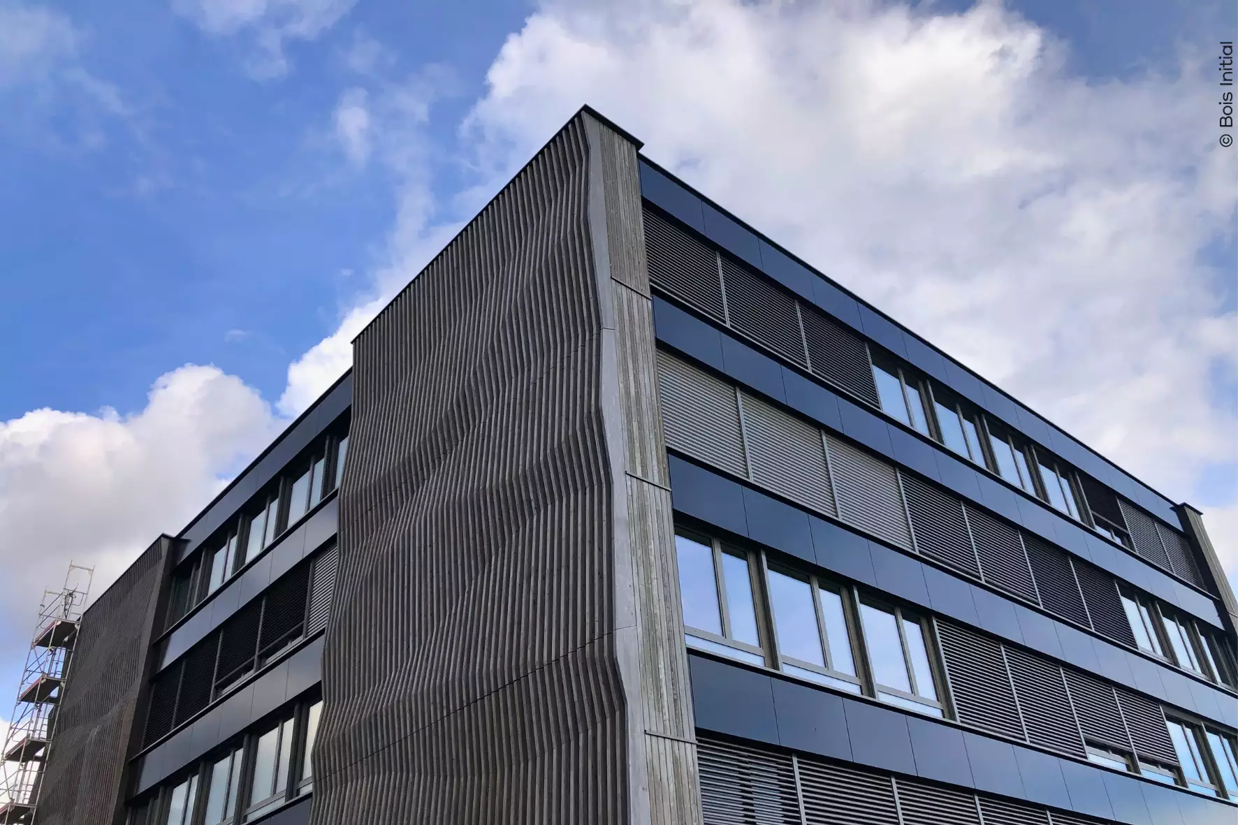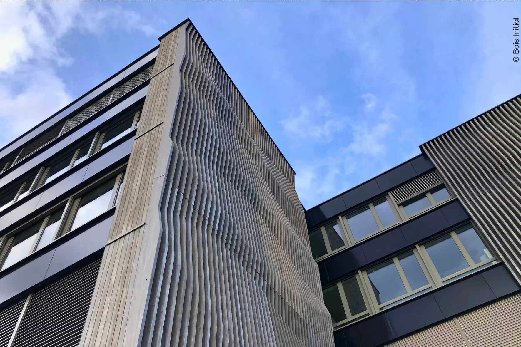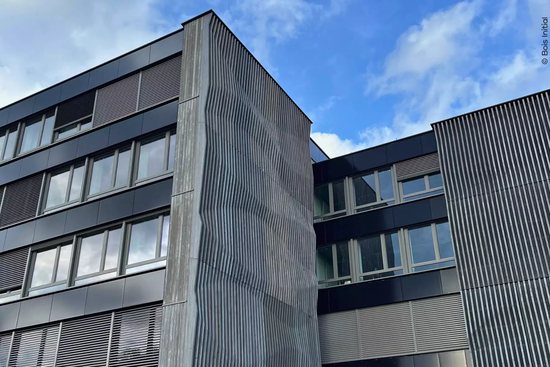 Dans le cas du collège de Gorgier, des carrelets en sapin blanc suisse ont été lamellé-collé puis usinés sur notre site de Glovelier. Pour obtenir ce rendu élégant de vague, chaque pièce est unique. Les carrelets ont été rabotés et autoclavés selon notre processus unique aux sels de cuivre, ceci dans le but d'augmenter encore la durabilité du bois.
