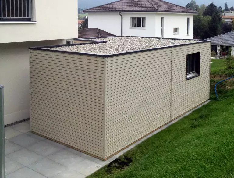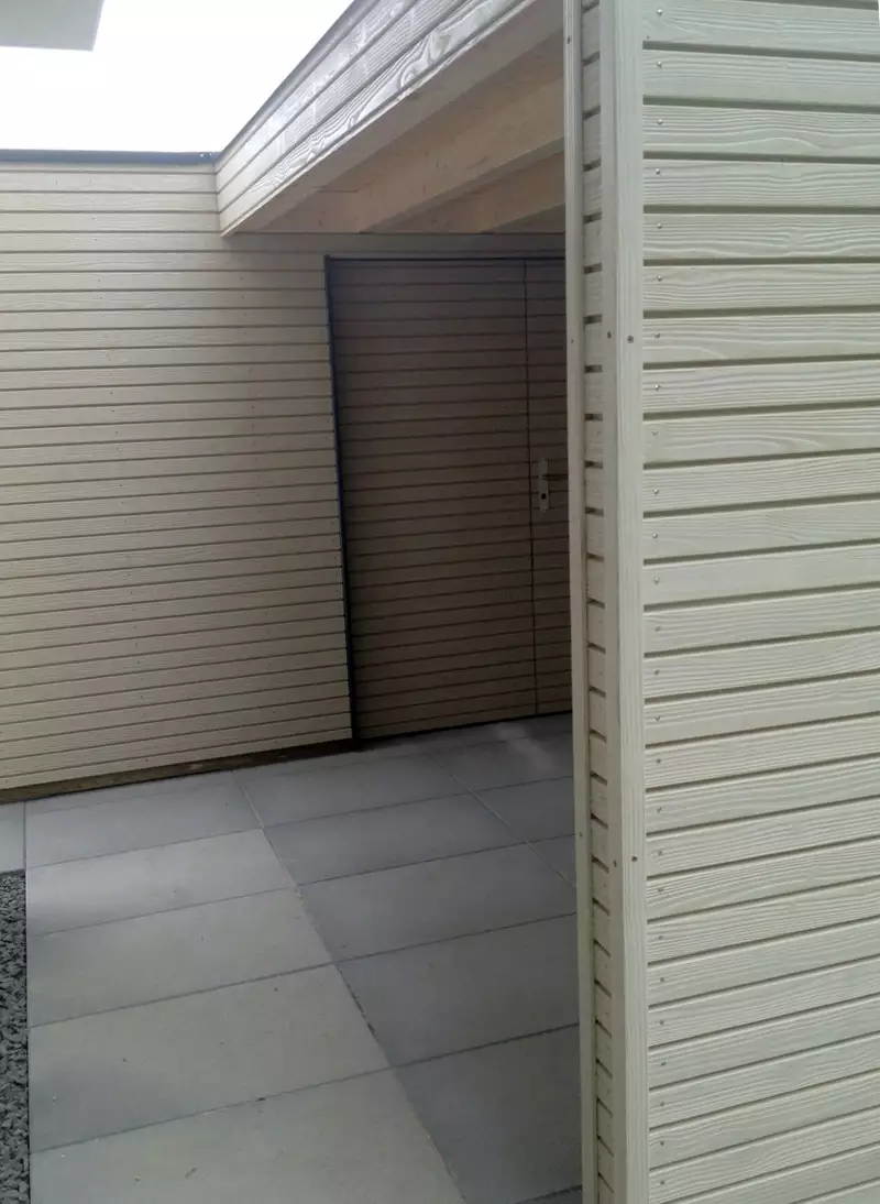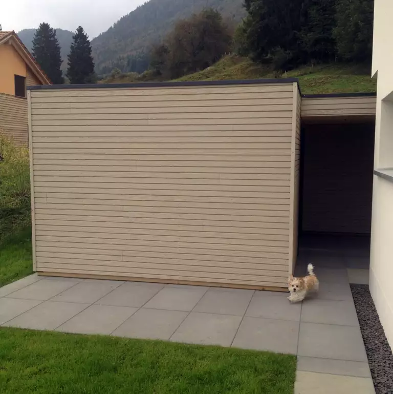 Couvert en forme de L en prolongation de la maison. Construction en ossature composée d’un abri et d'une terrasse couverte:
