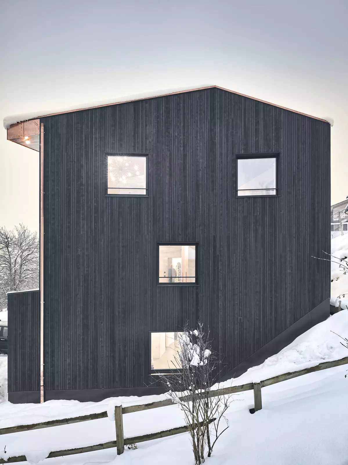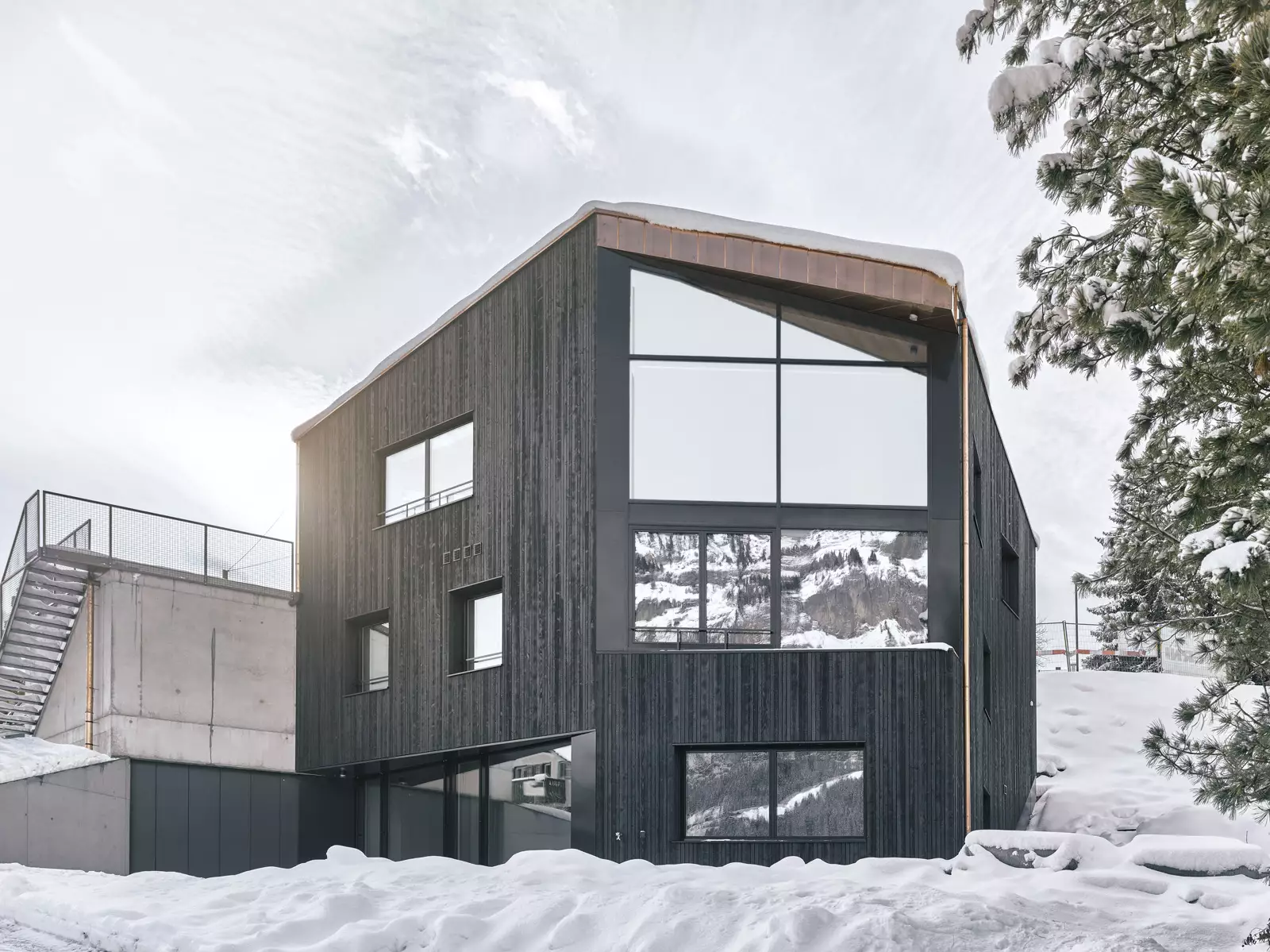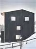 Die Fassade ist mit ca. 250 m2 verkohlte Holzschalung verkleidet.