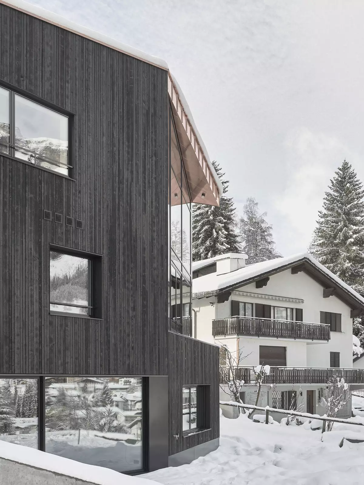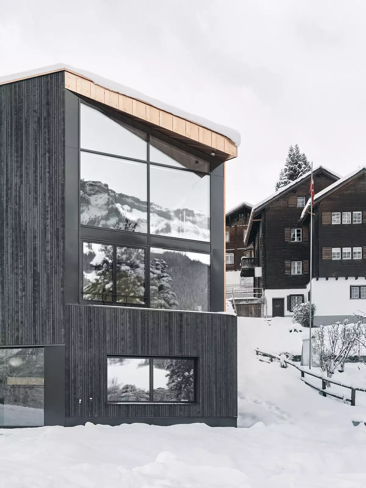 Das Wohnhaus für eine fünfköpfige Familie ist auf einem unbebauten Grundstück im Siedlungsbestand von Flims geplant und realisiert worden. Die ausgeprägte Hanglage des Grundstücks und der Blick zum markanten Flimserstein legen die Ausrichtung fest und bestimmen Form und Gestalt des Wohnhauses mit. Grosszügige Öffnungen in der Fassade setzen das Innere der Wohnräume mit der Berglandschaft in Beziehung.