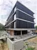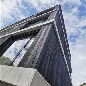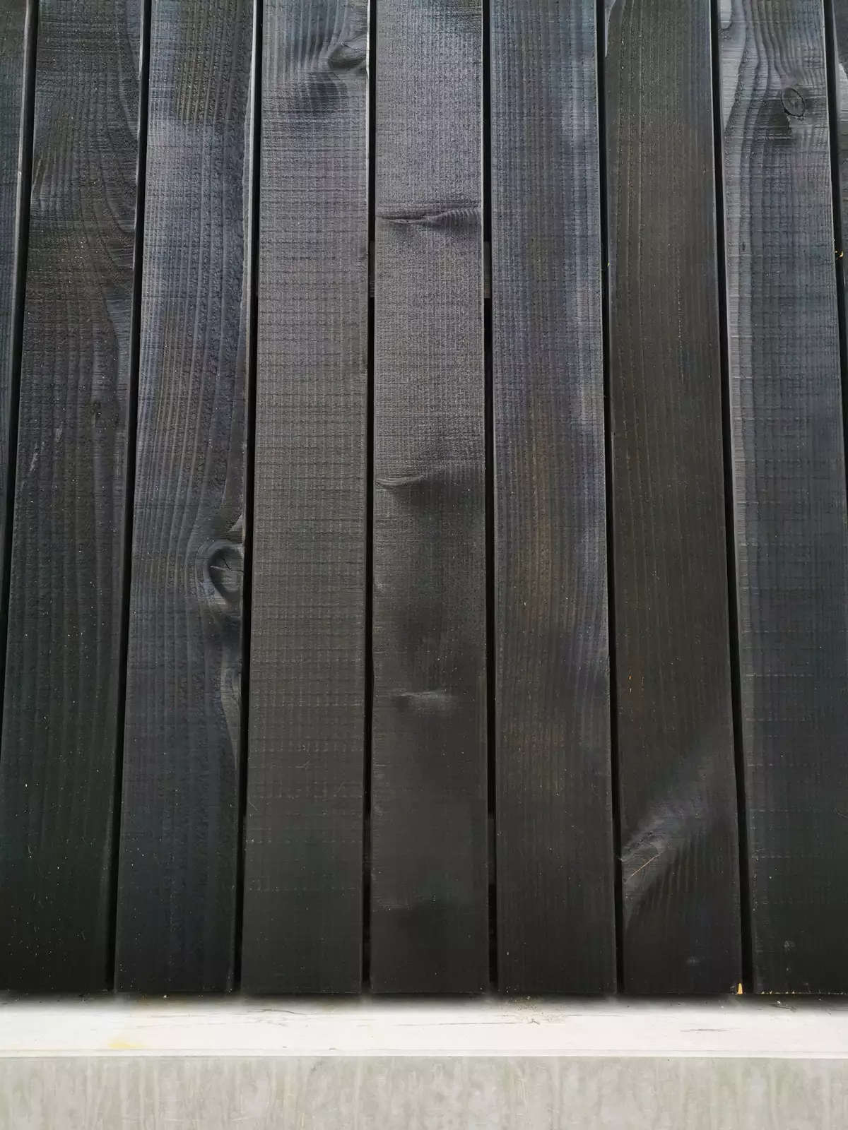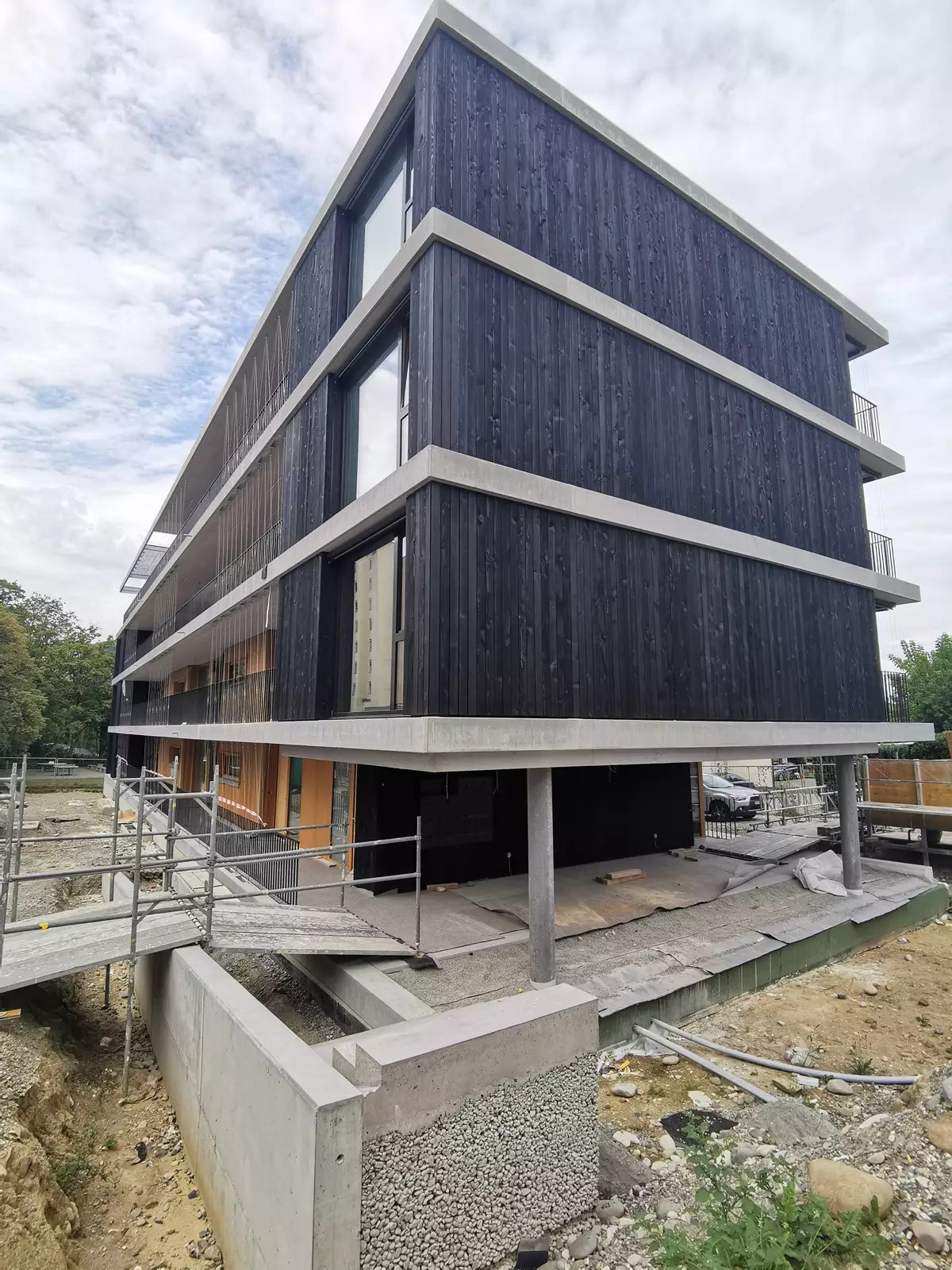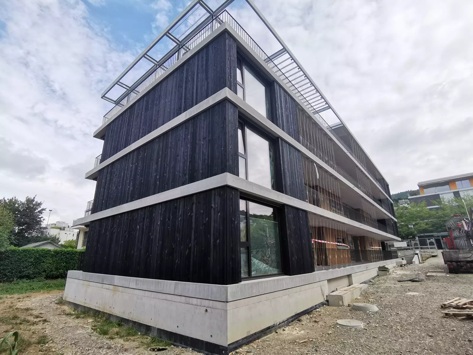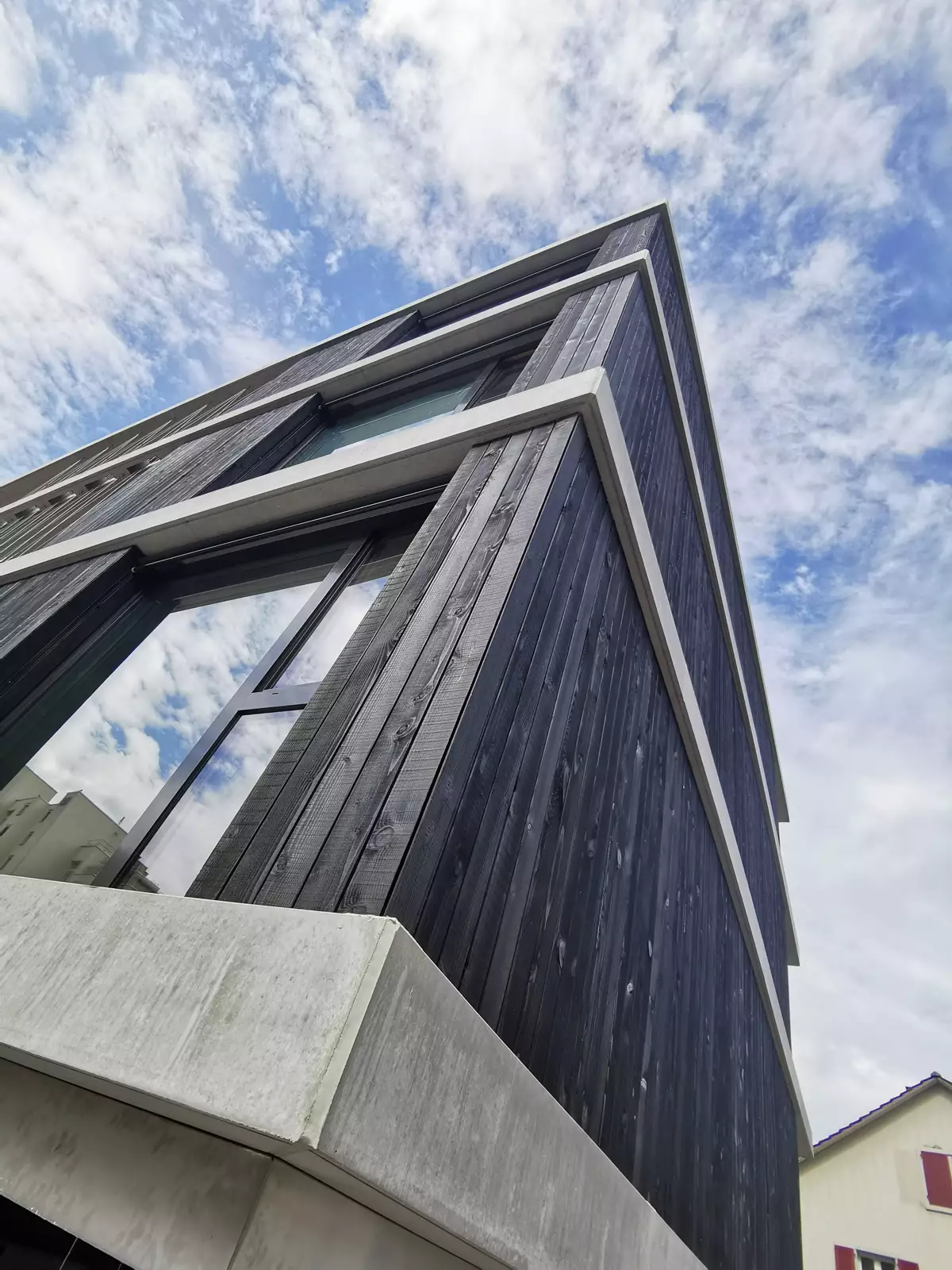 Nous avons livré environ 300 m2 de bardage bois en douglas suisse. Des planches parallèle sans chanfrein (rabotées 4 faces avec une finition surface visible finement sciée) pour une pose ajourée. Le bois n'est pas carbonisé, mais traité avec un saturateur noir (huile à base d'eau). La surface brute de sciage permet une très bonne pénétration de l'huile dans le bois et garantit une bonne stabilité de la couleur. Avec toutes les lames de même format (21 x 110 mm), l'entreprise de construction bois a pu monter une façade très moderne.