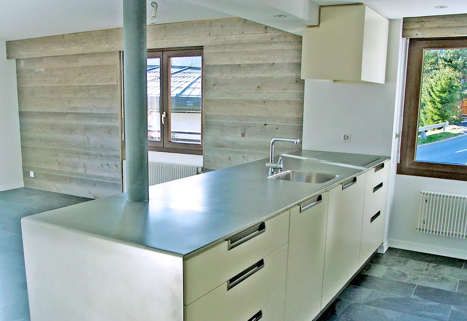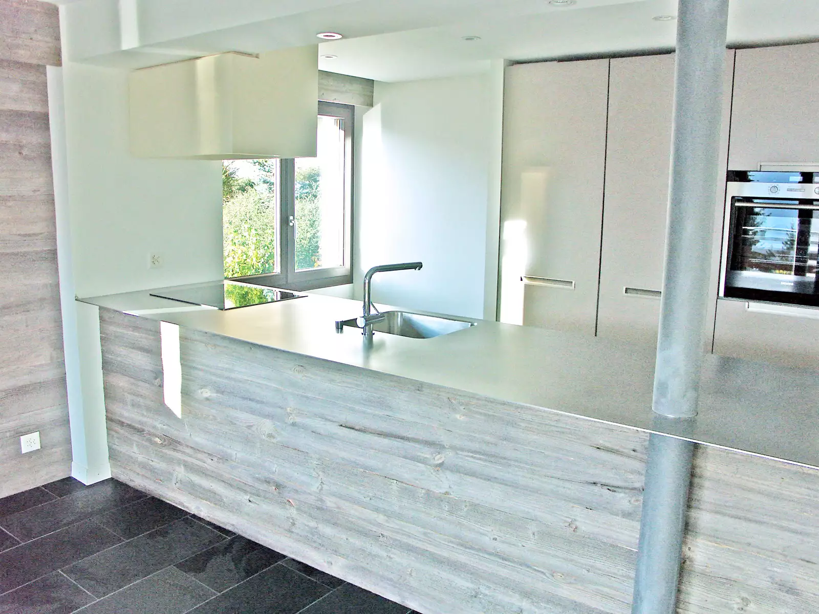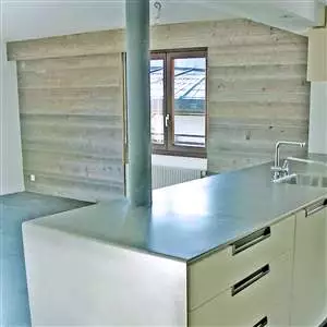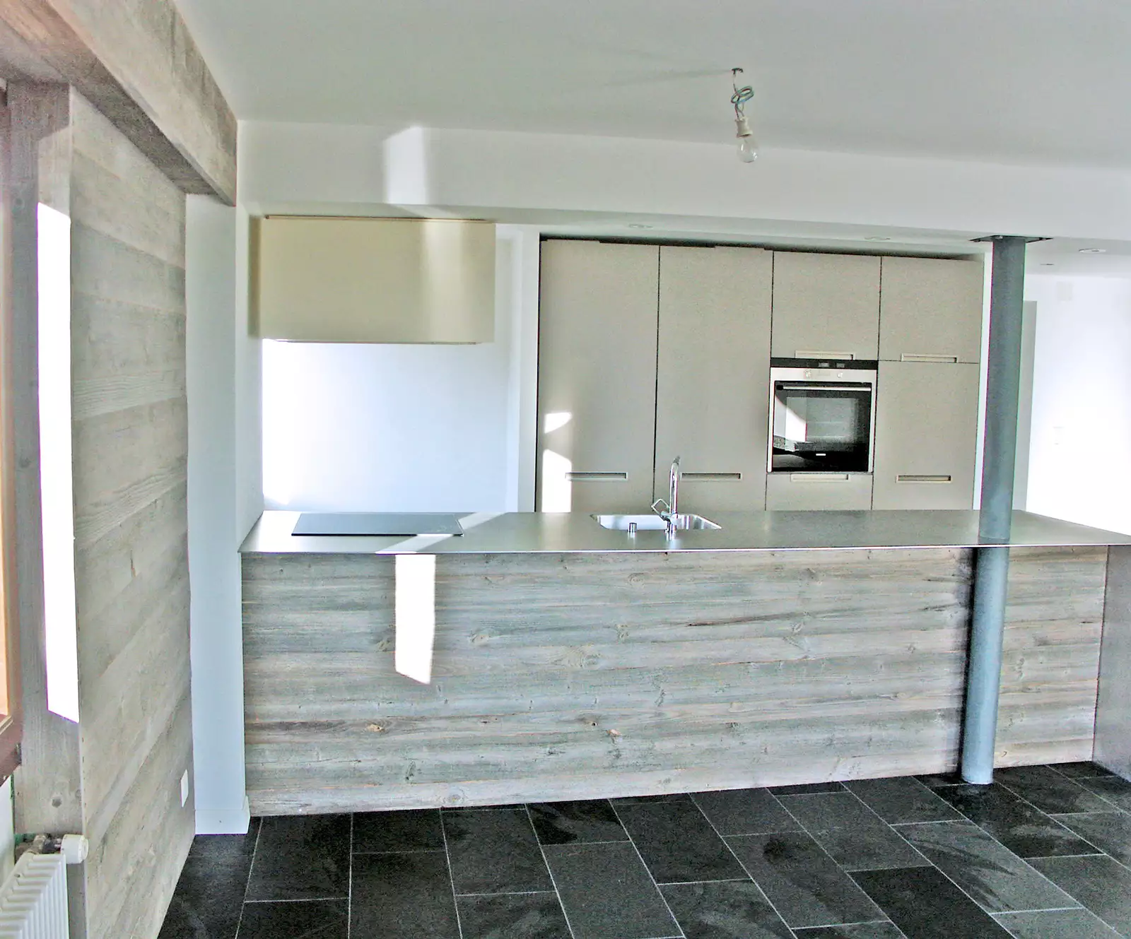 Habillage en lames naturellement grise ECOGRIS® structure, aspect rustique et brossé. Le contraste du tout lisse et brillant face à la rugosité de planche grise structuré renforce le coté contemporain.