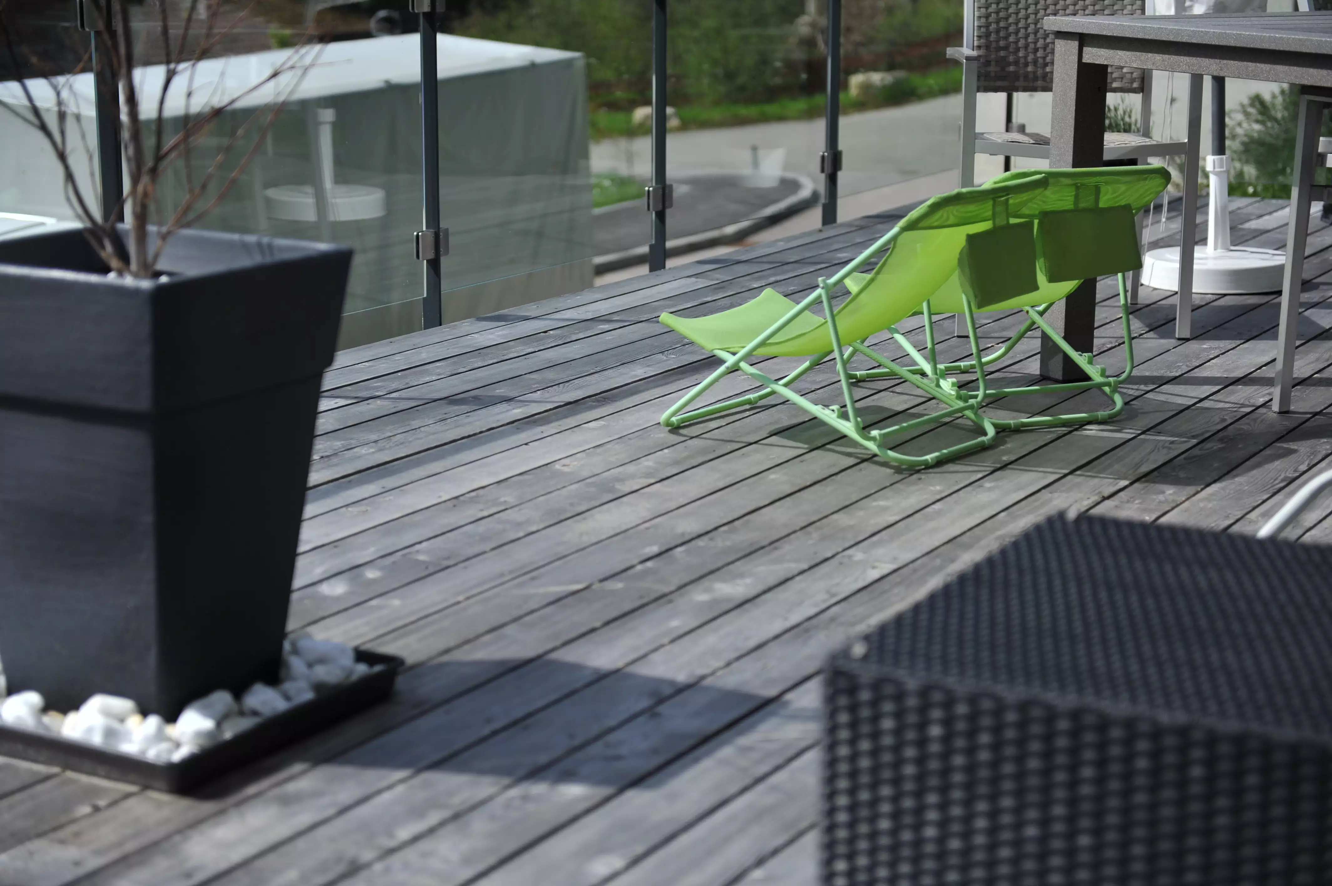 Nous avons fourni des lames de terrasse en mélèze suisse, avec une finition ECOGRIS®, bois pré-grisaillé.