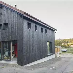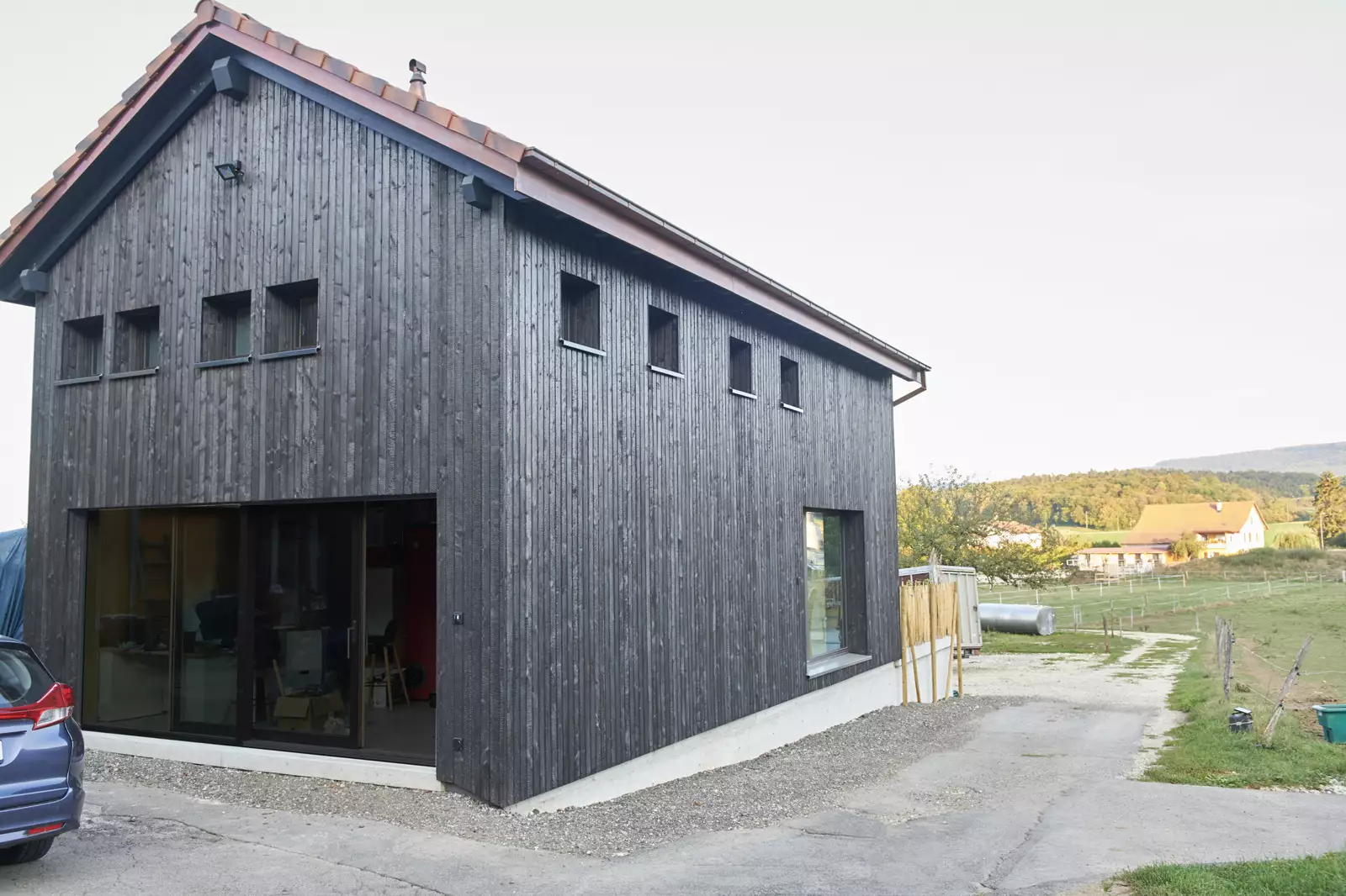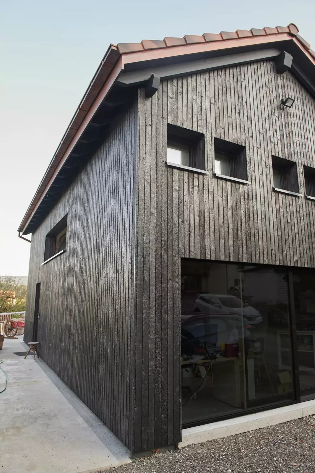Avec la collaboration du bureau d’architecture « Atelier.frd », nous avons sélectionné un bardage en adéquation avec le projet. Frédéric Ramseyer voulait une façade de caractère, foncée, et pas trop « vue » dans le Jura… Il souhaitait utiliser cette technique novatrice et peu répandue mais qui a déjà fait ses preuves.