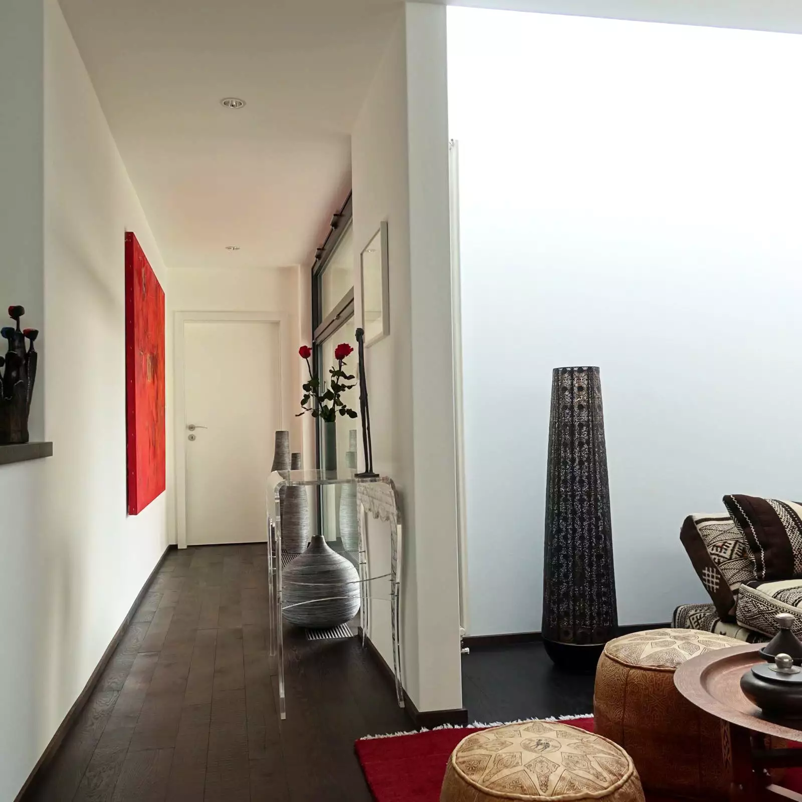 Changement de 110 m2 de parquet pour cette maison de Mallerey. Un plancher massif sur-mesure en chêne vapo a été posé. Des lames de 12 mm ont été collées en plein puis traitées sur place avec une huile foncée. Il s’agit d’une pose en pont de navire avec plusieurs largeurs (100, 120, 140 mm) et longueurs (de 0,60 à 2,00 m).