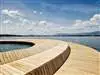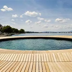 Aujourd’hui les baigneurs peuvent profiter d’un ponton flottant de 40 mètres de diamètre constitué de deux anneaux entre lesquels s’insère un banc courbe en forme de vague. Avec en prime, un point de vue unique sur la rade et le jet d’eau de Genève. L’objet représente une surface de 900 m², il est composé de 227 pièces pré-assemblées dans nos ateliers et 5'000 lames de bois.