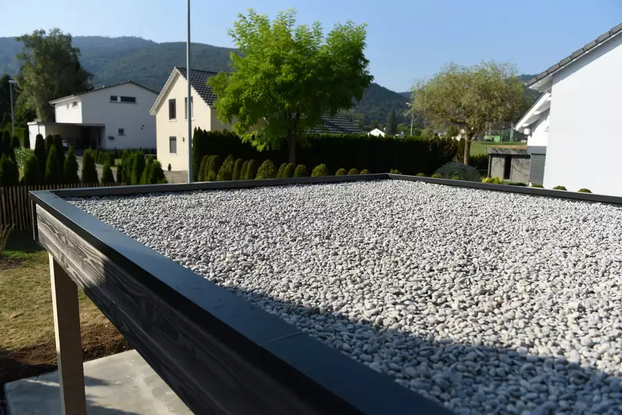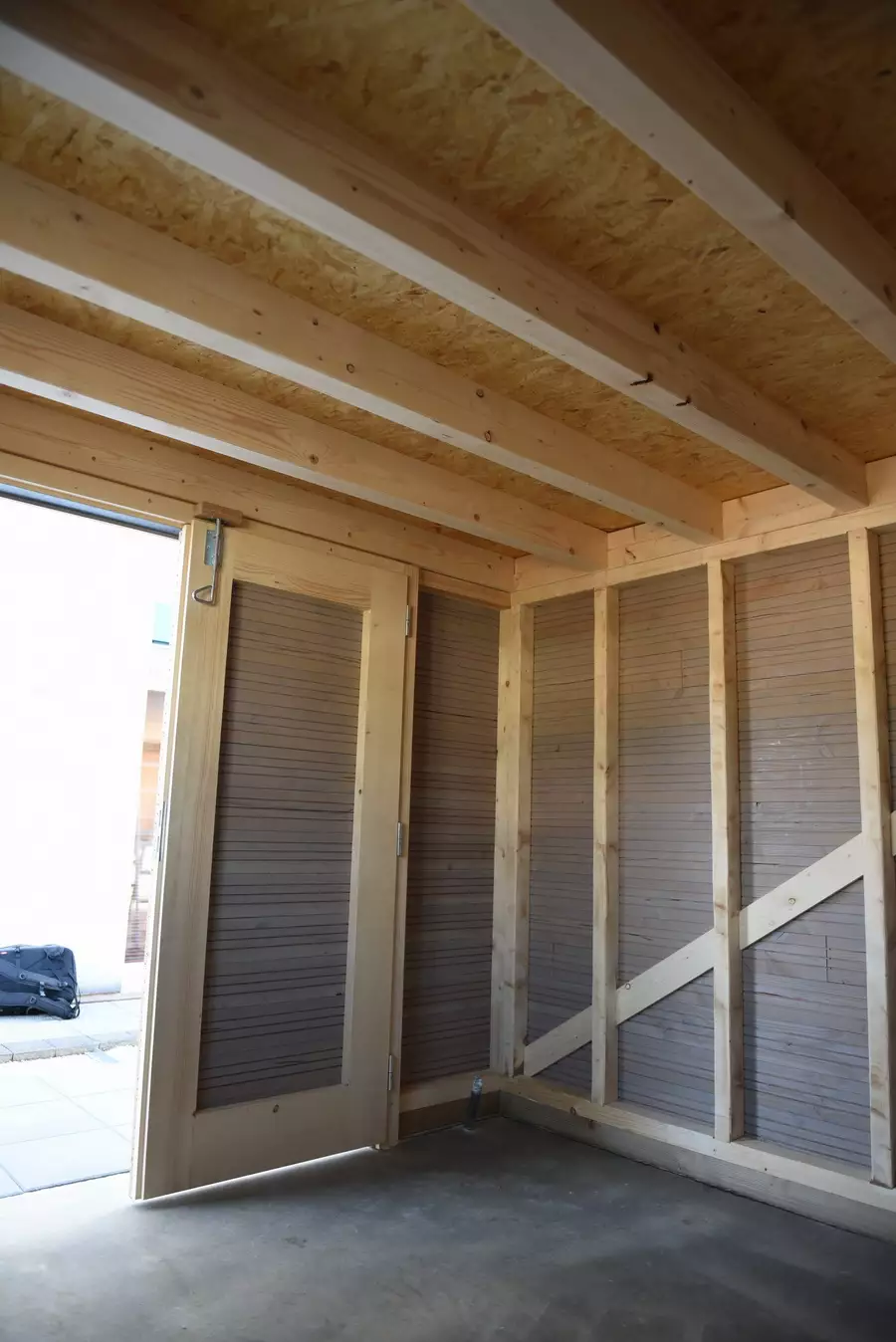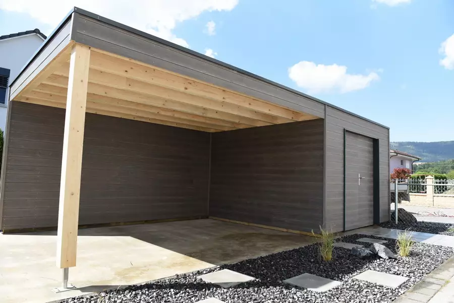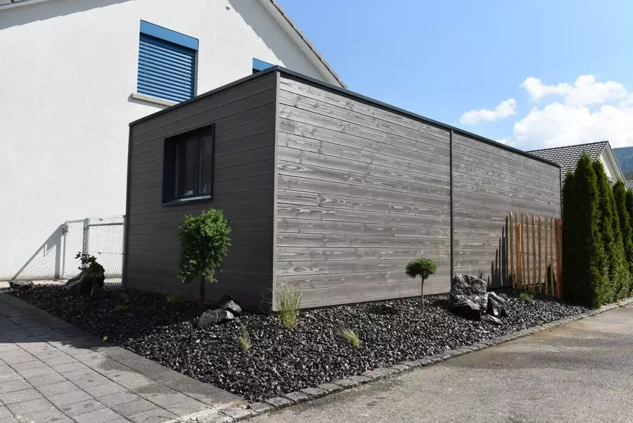 Couvert préfabriqué, composé d’un box fermé de 3.00 m x 3.00 m et d’une terrasse couverte de 4.00 m x 3.00 m, Hauteur 2.25 m.