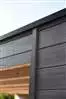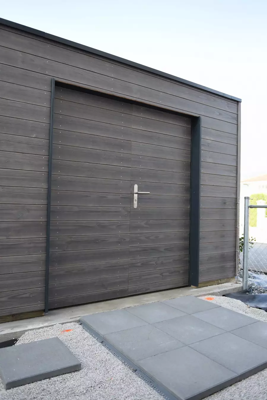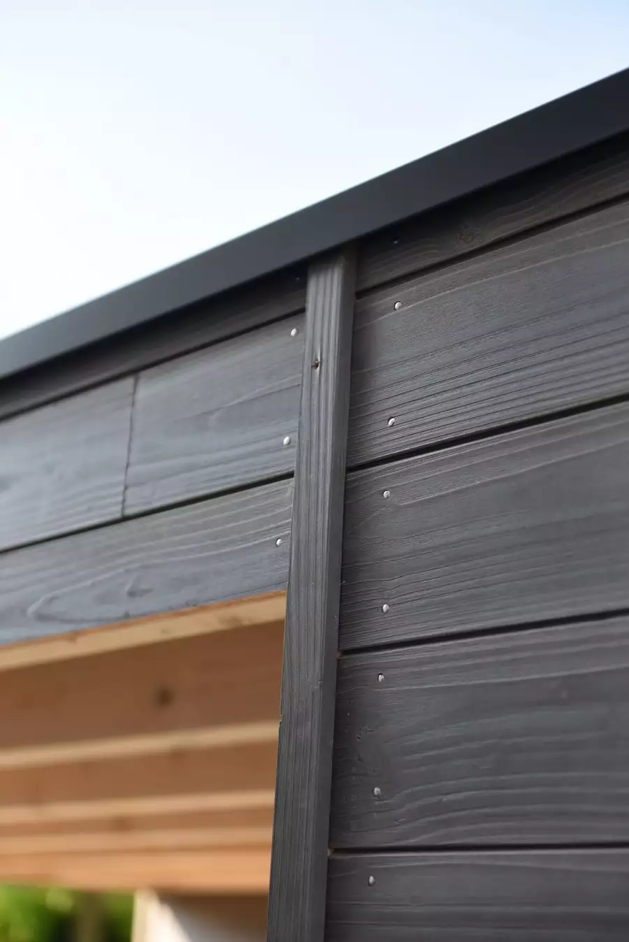 Un abri préfabriqué dans nos ateliers, habillé avec un bardage en Douglas brossé avec application d'un saturateur aspect grisé couleur ardoise.