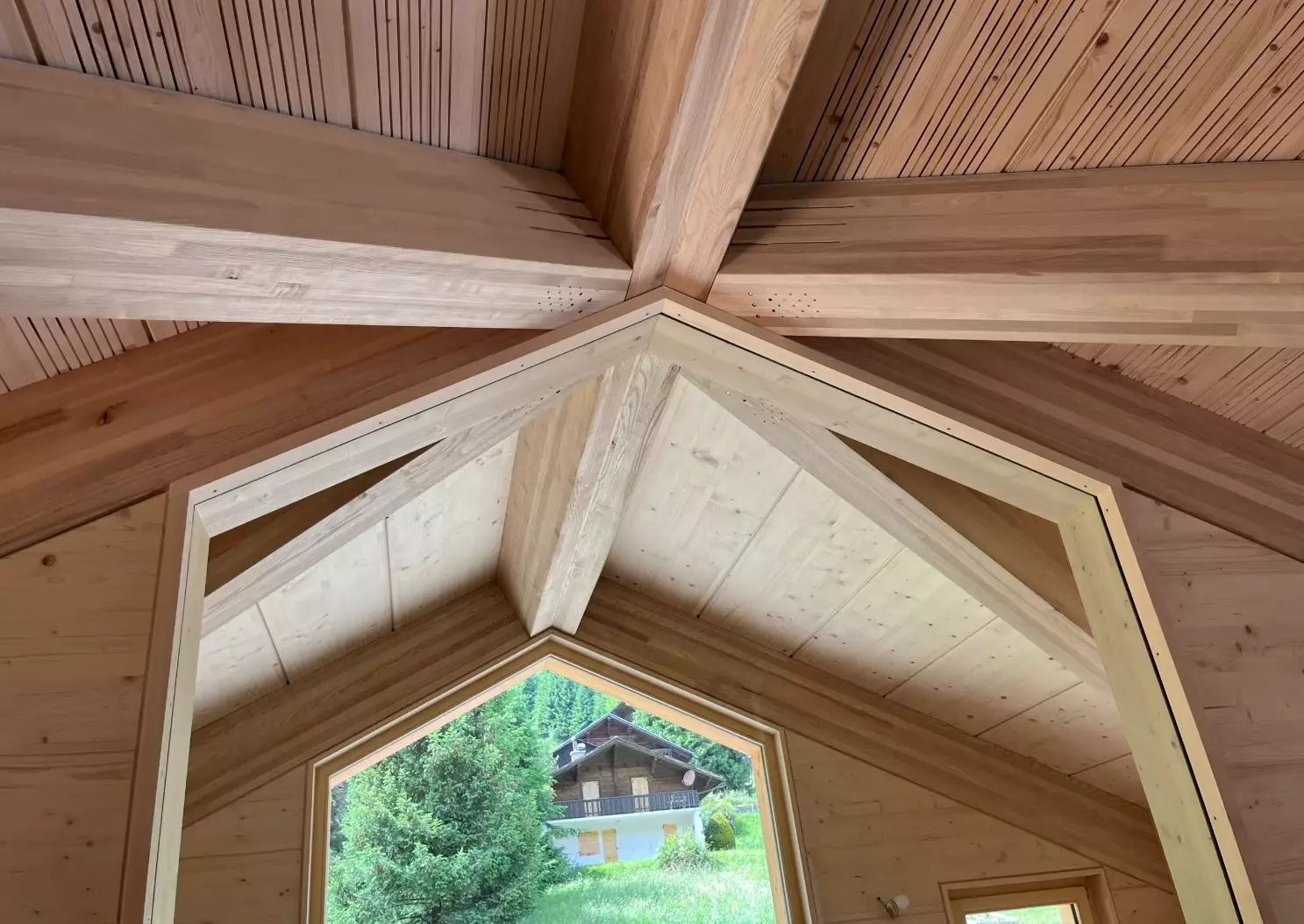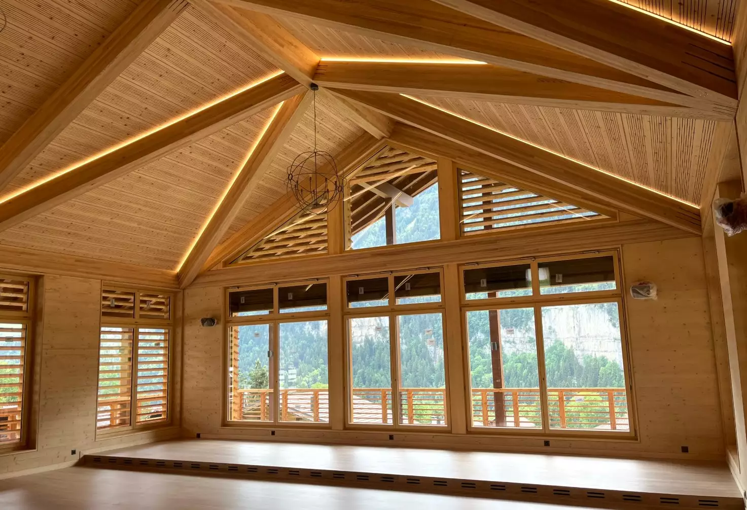 Le bois est typiquement le matériau qui inspire ces valeurs. Naturel, clair et varié, il entre parfaitement en harmonie avec la salle de yoga que nous avons réalisée à Champéry.
