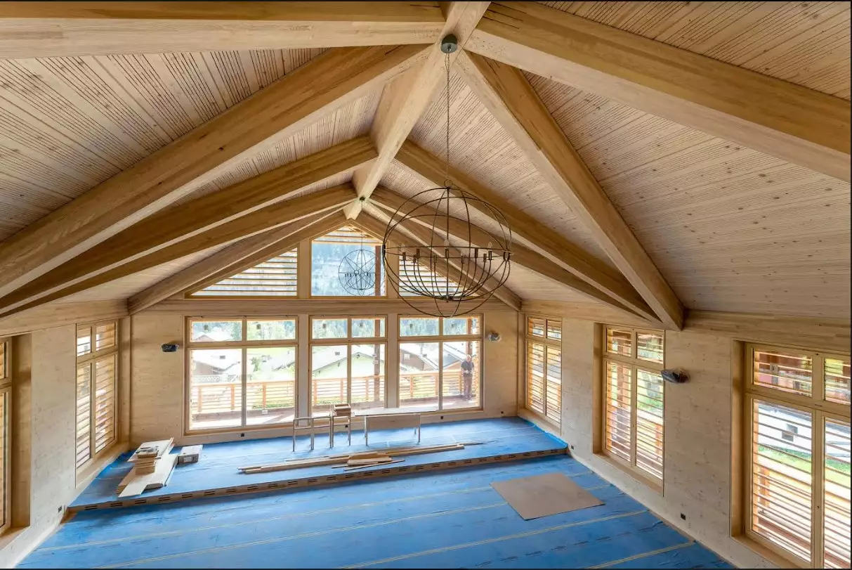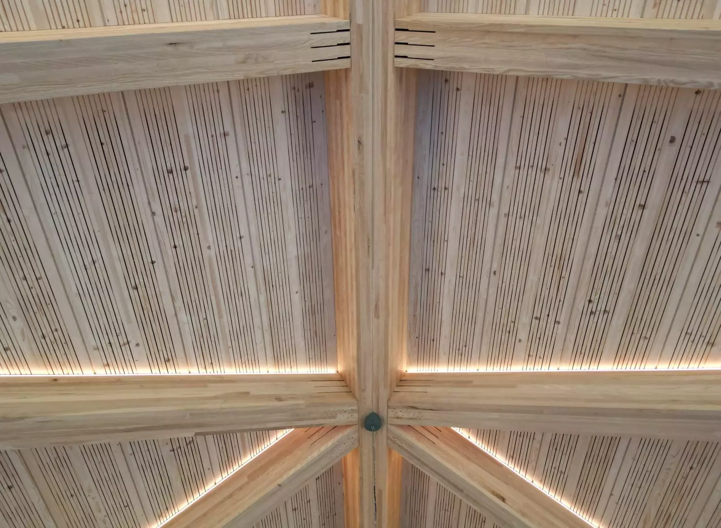 Afin de renforcer l’élégance de cette salle faite tout de bois Fagus Suisse SA a utilisé le frêne pour accorder à cet espace une ambiance confortable et chaleureuse. Le frêne est également une essence particulièrement utilisée dans les constructions réalisées en montagne pour son accord visuel parfit avec l’épicéa.