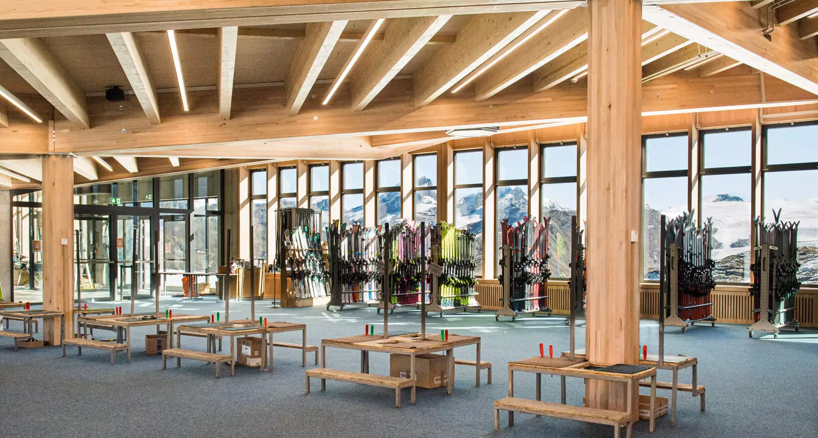 Pour cette réalisation, Fagus Suisse SA a fourni le bois de construction en hêtre, choisi pour sa robustesse exceptionnelle et sa stabilité mécanique sous fortes contraintes. En altitude, où les charges de neige atteignent des valeurs considérables, le hêtre lamellé-collé déploie tout son potentiel : il permet la création de structures fines et légères mais hautement résistantes, tout en offrant une esthétique naturelle et chaleureuse à l’intérieur du bâtiment.