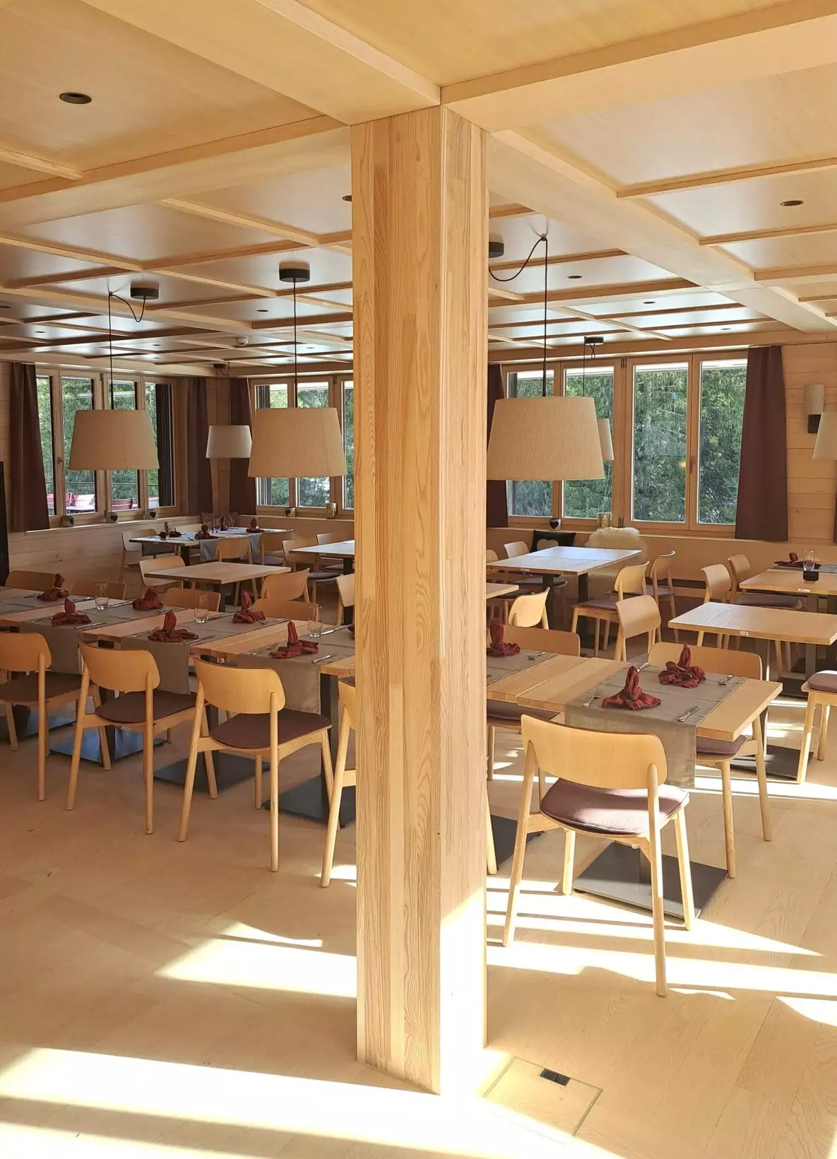 Pour cette réalisation, Fagus Suisse a réalisé des piliers en bois tasseaux-collés en frêne. Cette production permet allier une résistance très élevée, une esthétique naturelle mais également tous les avantages écologiques du bois.