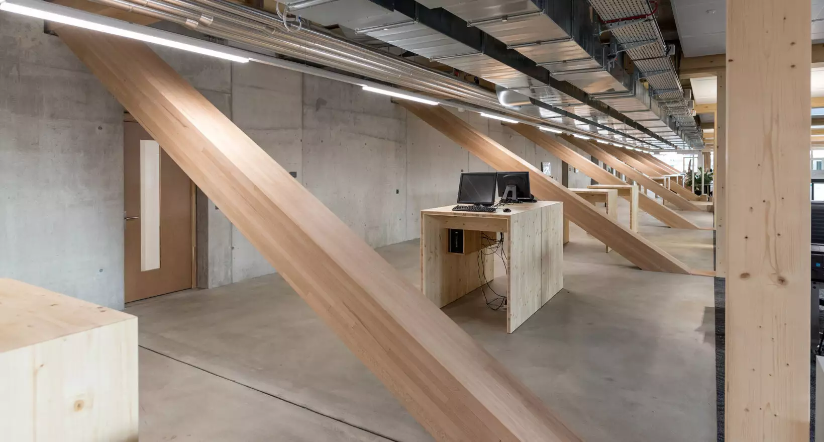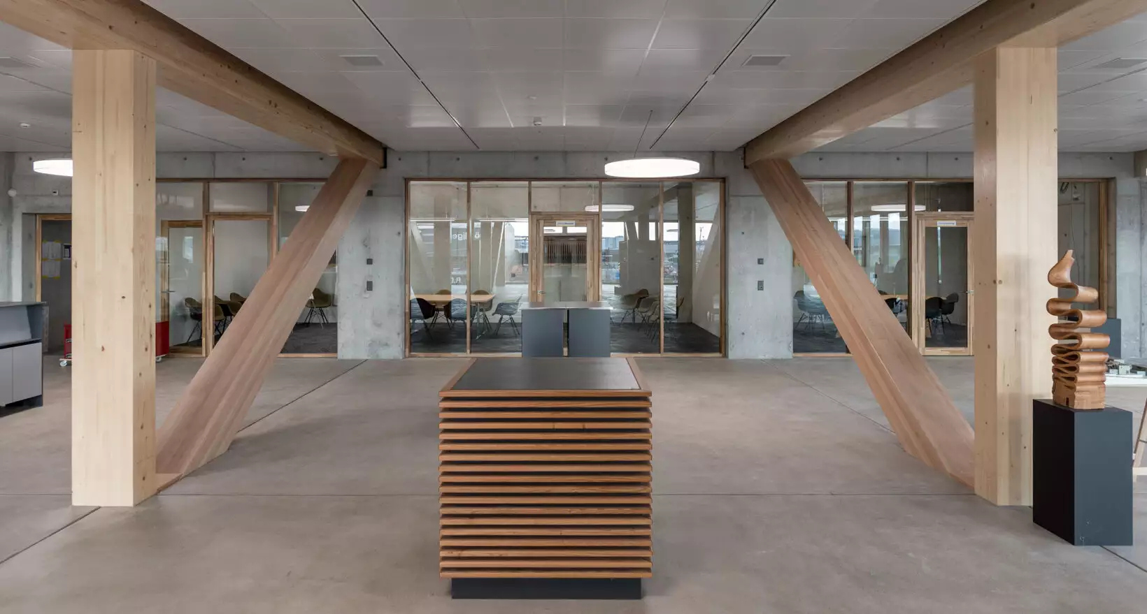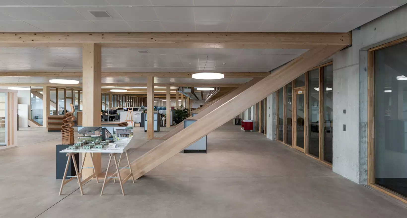 La structure porteuse du bâtiment a été fournie par Fagus Suisse SA, qui a mis en œuvre son savoir-faire dans l’ingénierie du bois pour concevoir un système d’appuis à la fois robuste et visuellement élégant. Les poutres inclinées et les colonnes massives définissent un rythme architectural fort, offrant à l’intérieur un sentiment d’ouverture et de légèreté.