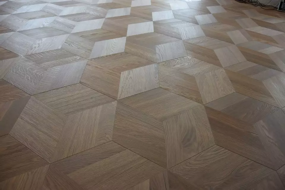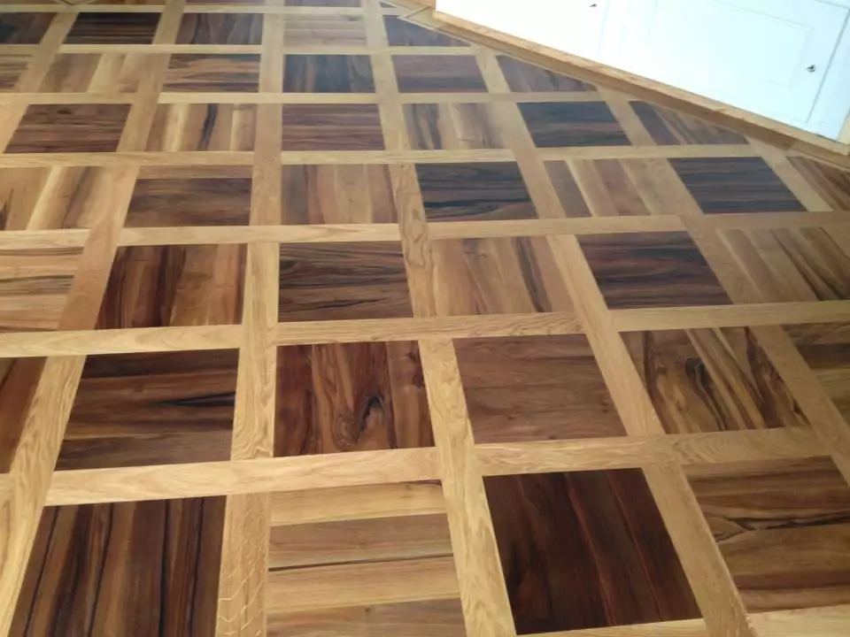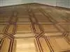 Exécution rainée avec languettes, surface poncée, pour pose clouée ou collée. Damier avec ou sans transversale.