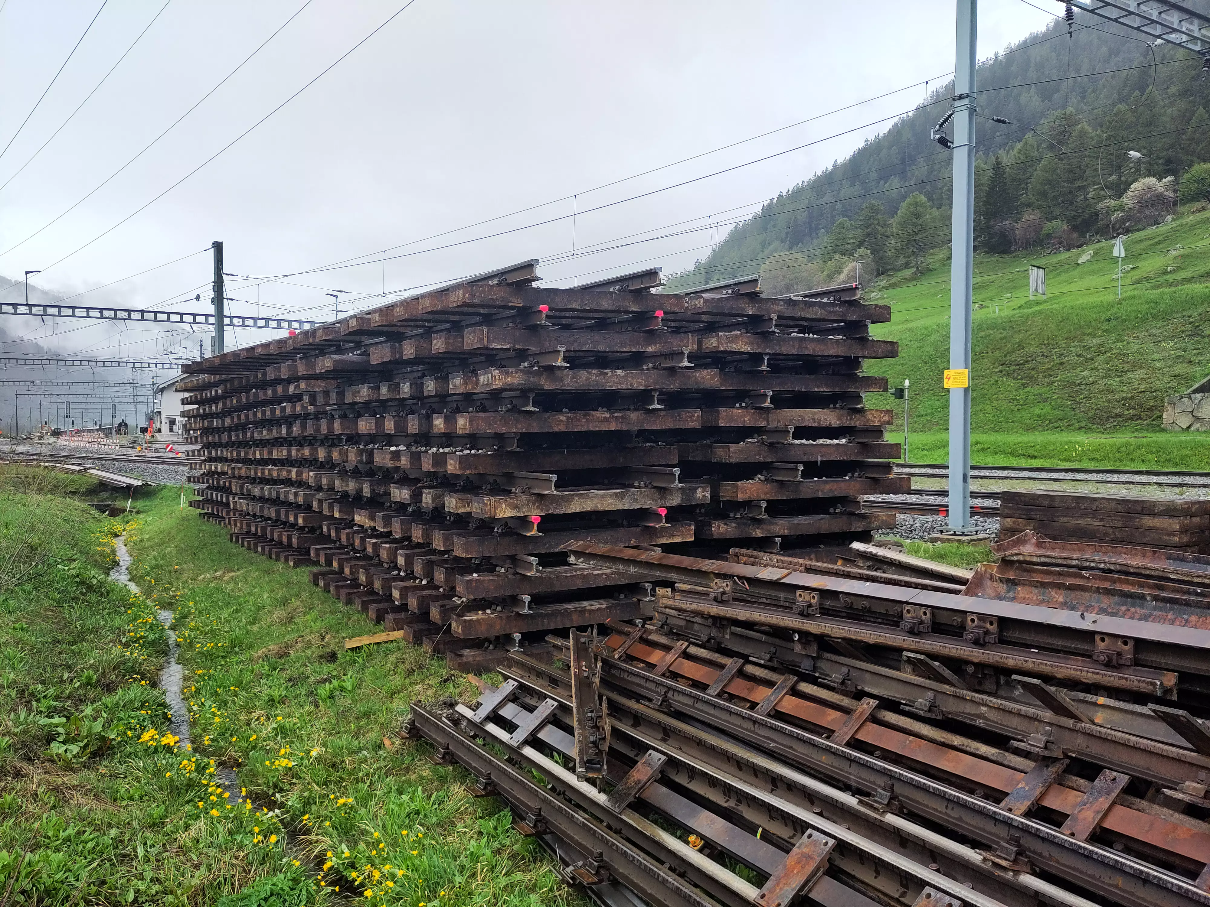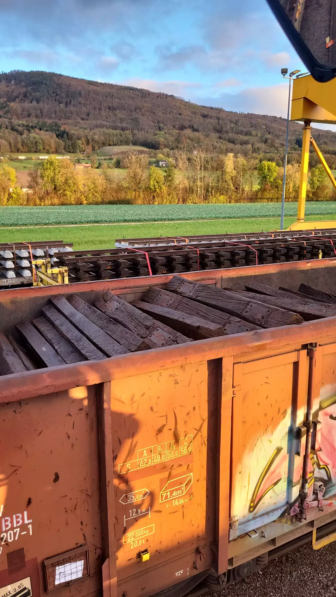 die Schwellen werden per Bahn nach Glovelier transportiert